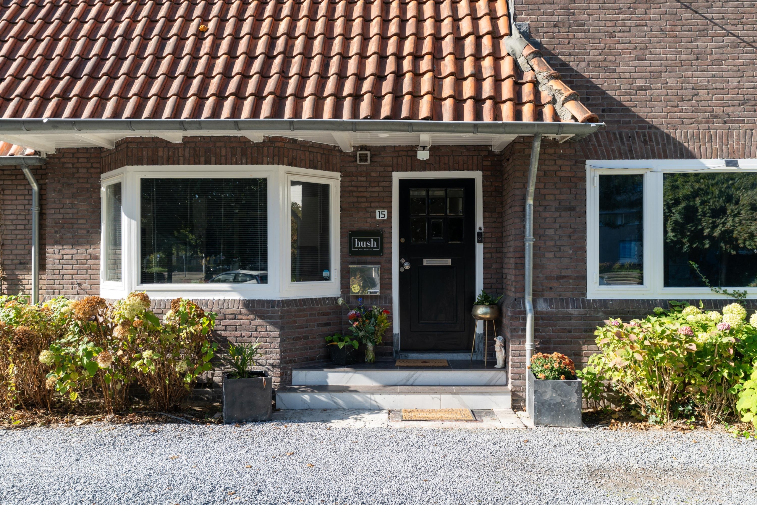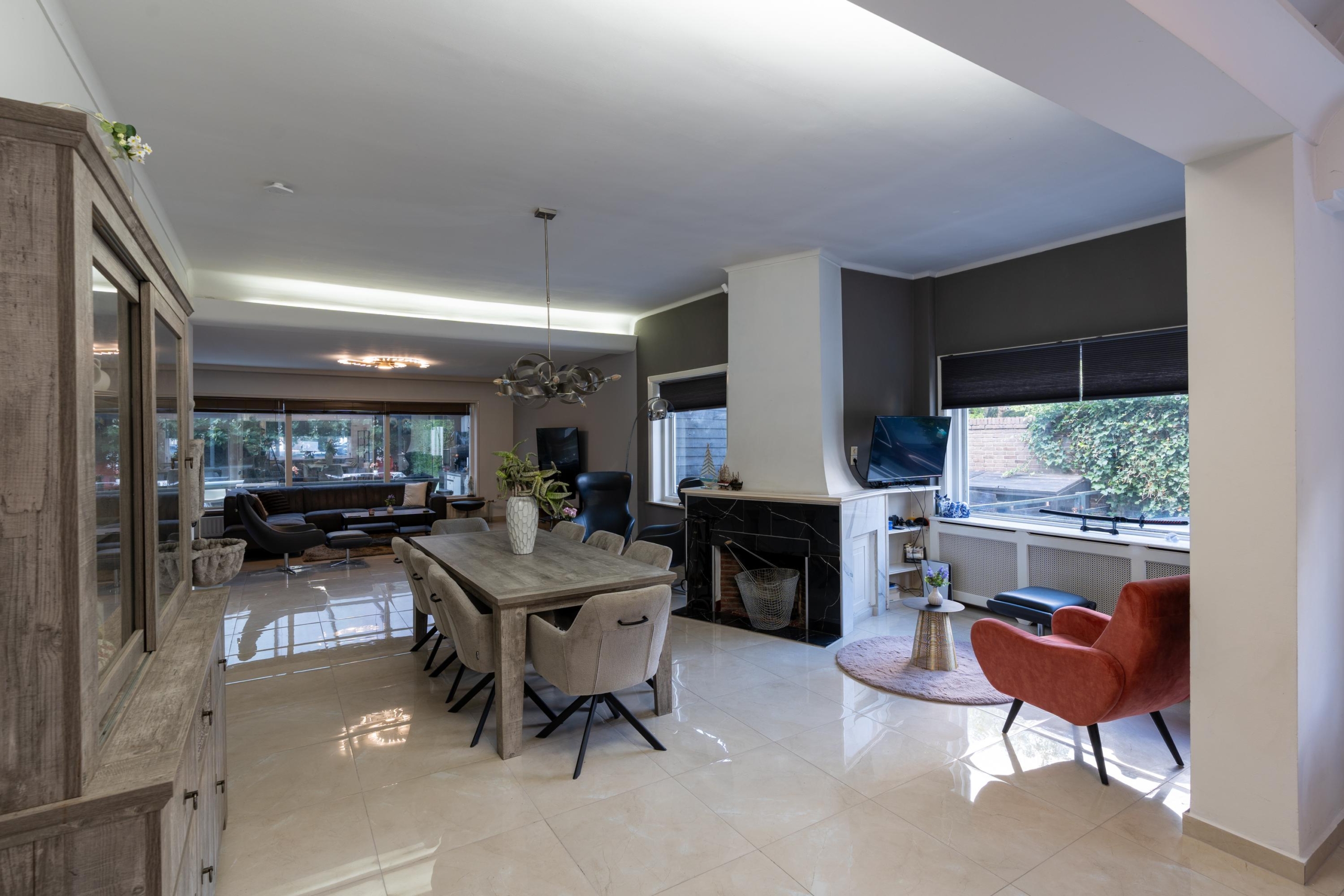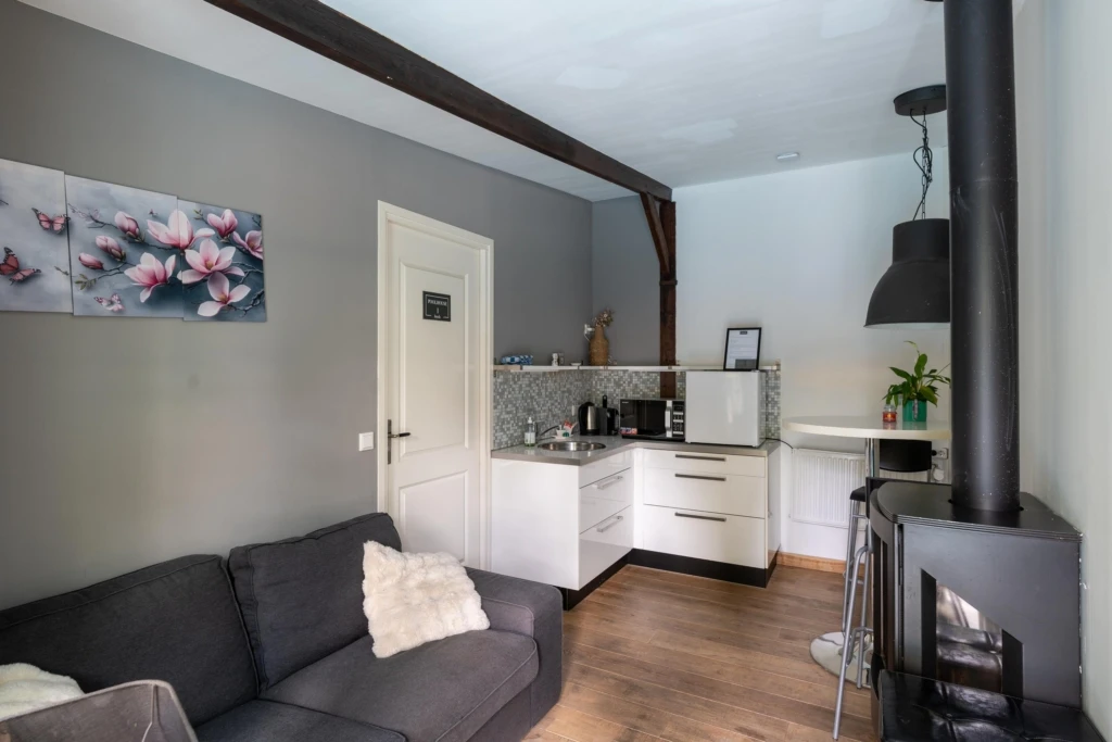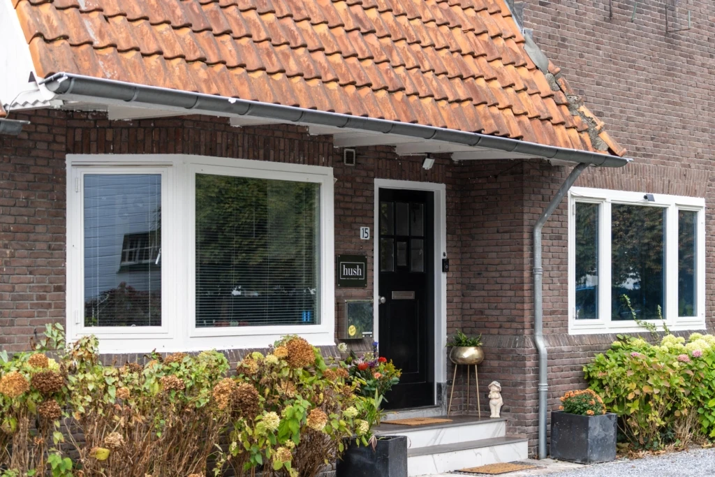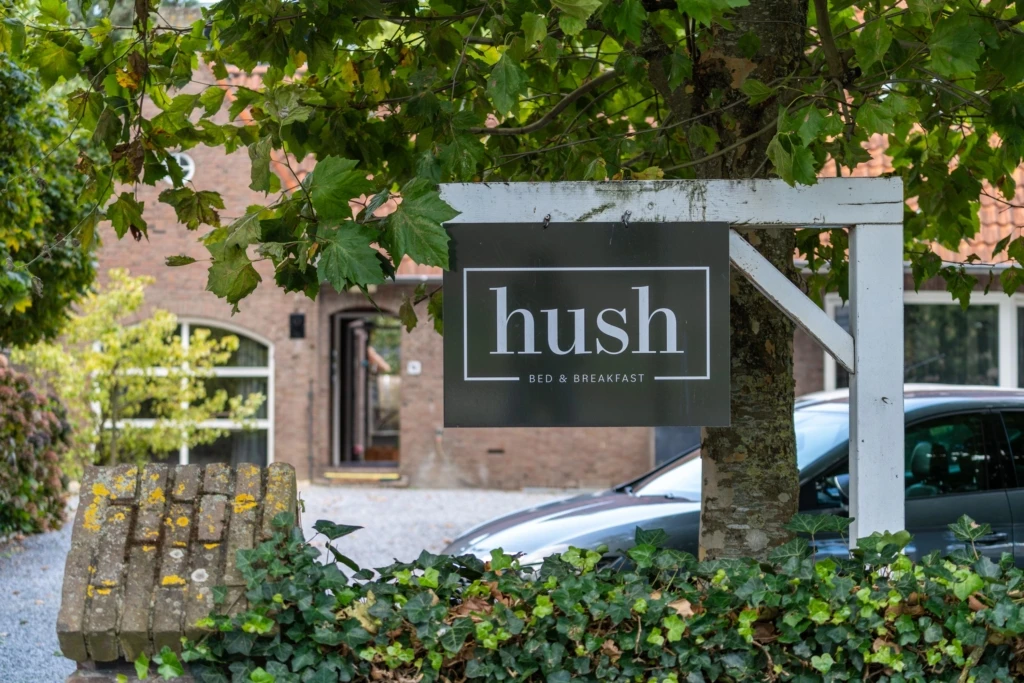 Via de keuken is de bijkeuken bereikbaar, met opbergruimte, aansluitingen voor wasmachine en droger, een stortbak en een trapopgang naar de B&B-kamer ‘De Cottage’. Gasten maken eveneens gebruik van deze toegang. Aan de andere zijde van de villa bevindt zich de royale living met woon- en eetgedeelte. Opvallend zijn de vele raampartijen, die zorgen voor een royale lichtinval en verbinding met de tuin. De ruimte beschikt onder meer over een robuuste schouw met open haard en biedt uitzicht op zowel de voor- als achtertuin. Via een eigen entree aan de tuinzijde is de B&B-kamer ‘The Hush Room’ te bereiken. Deze kamer grenst aan de woonkamer en de centrale hal en heeft een aparte toegang van buitenaf.
