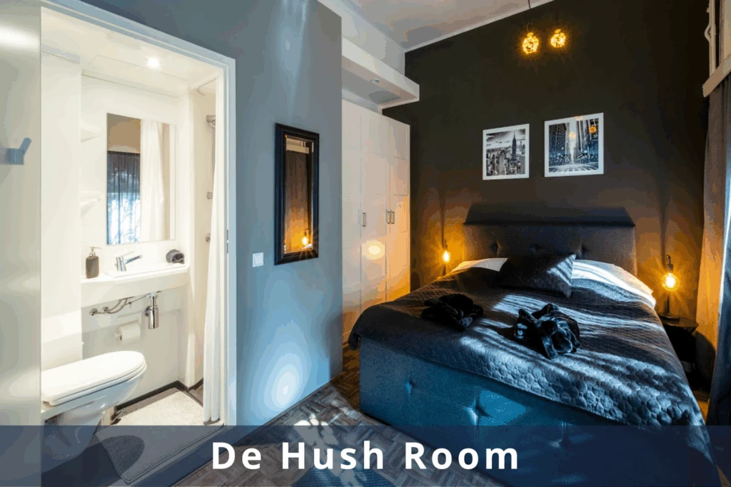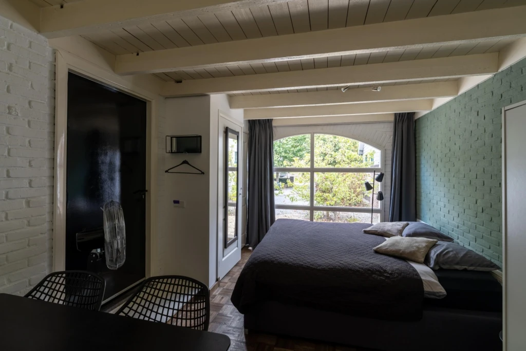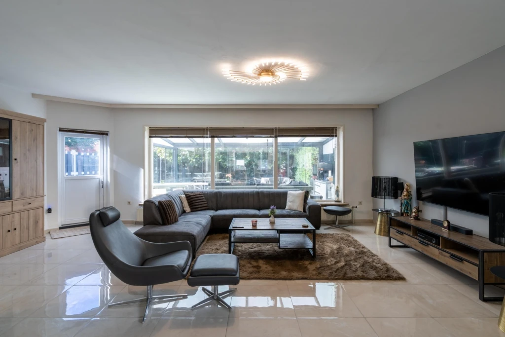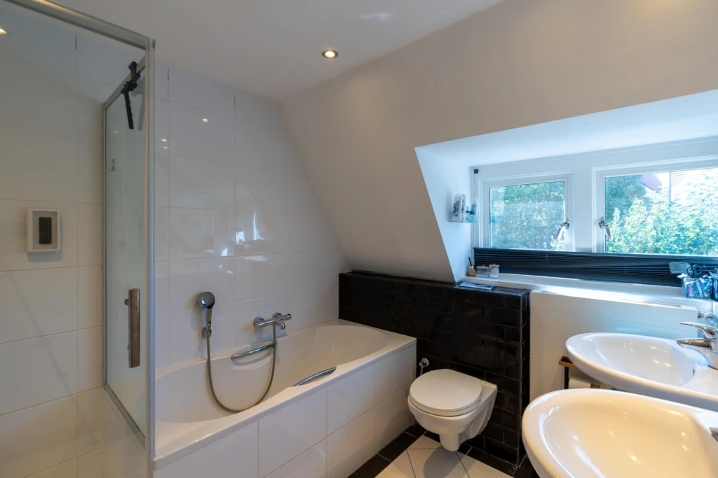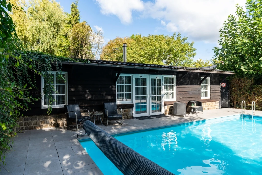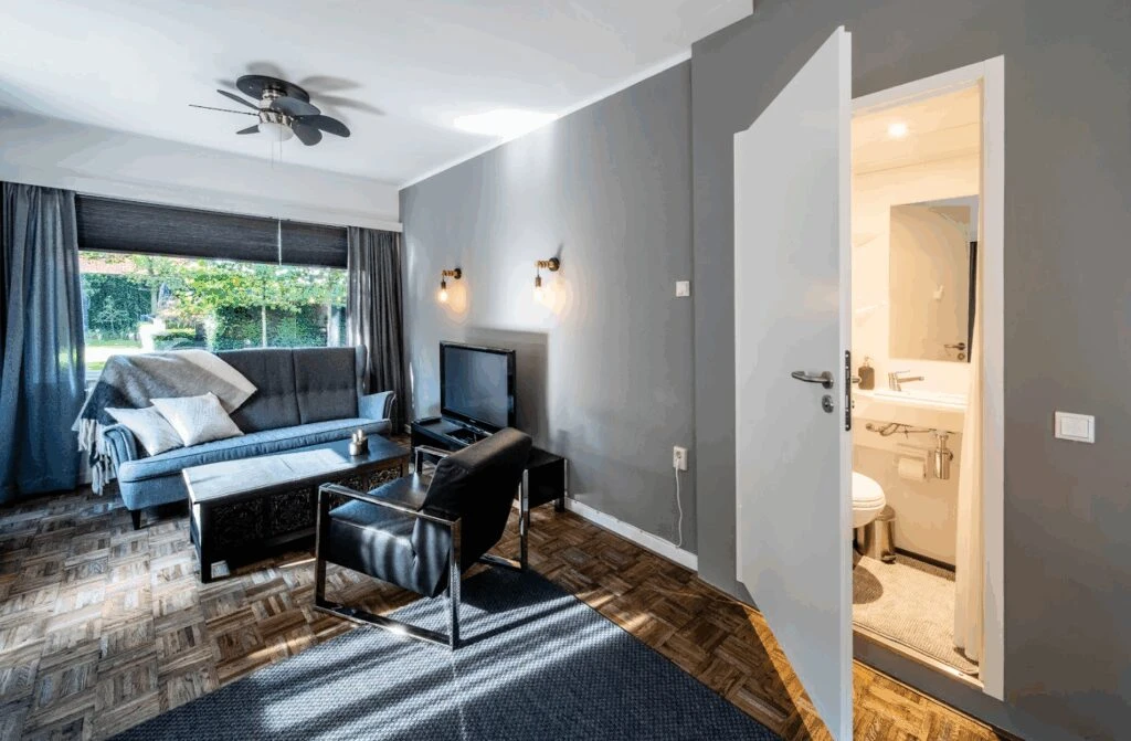 Via de keuken is de bijkeuken bereikbaar, met opbergruimte, aansluitingen voor wasmachine en droger, een stortbak en een trapopgang naar de B&B-kamer ‘De Cottage’. Gasten maken eveneens gebruik van deze toegang. Aan de andere zijde van de villa bevindt zich de royale living met woon- en eetgedeelte. Opvallend zijn de vele raampartijen, die zorgen voor een royale lichtinval en verbinding met de tuin. De ruimte beschikt onder meer over een robuuste schouw met open haard en biedt uitzicht op zowel de voor- als achtertuin. Via een eigen entree aan de tuinzijde is de B&B-kamer ‘The Hush Room’ te bereiken. Deze kamer grenst aan de woonkamer en de centrale hal en heeft een aparte toegang van buitenaf.