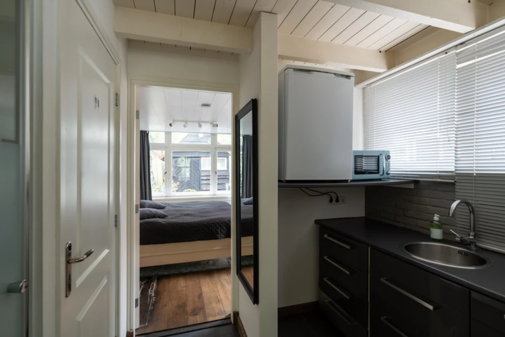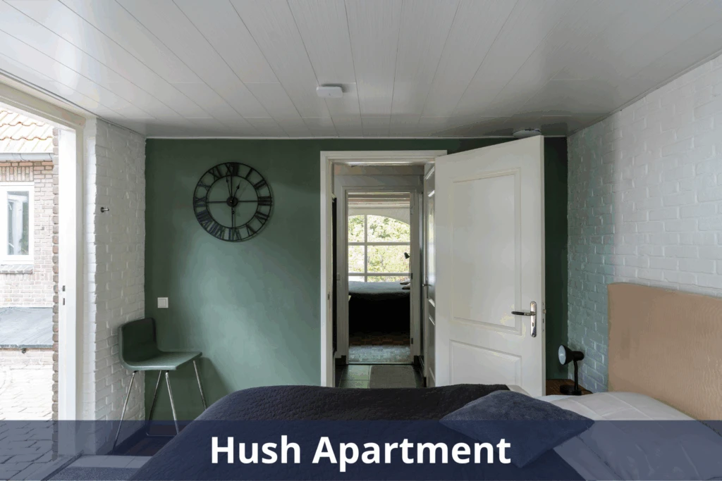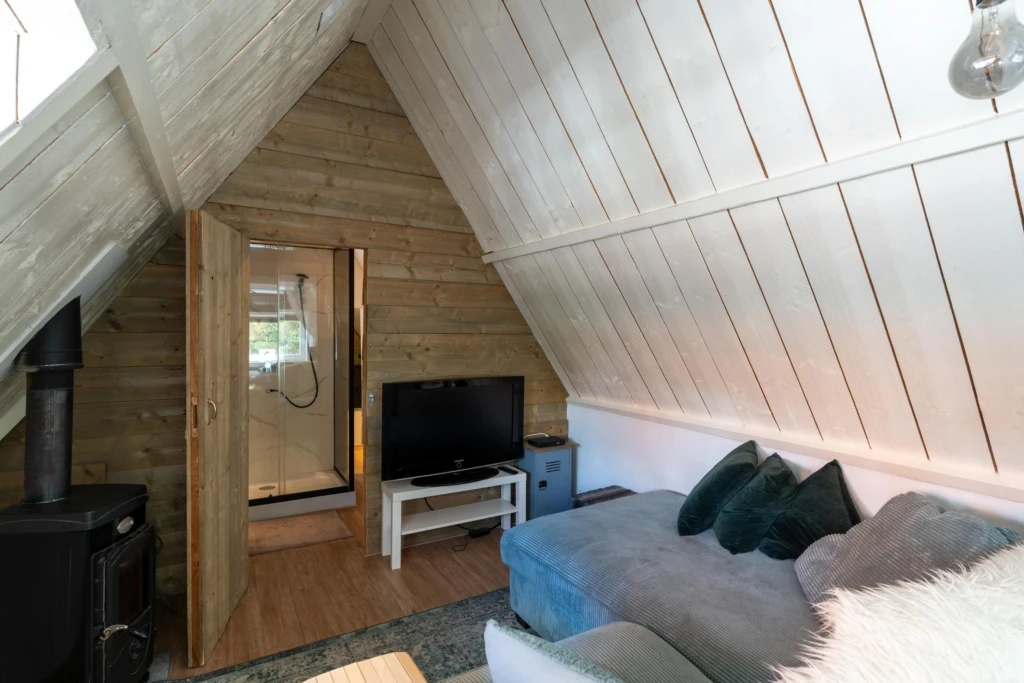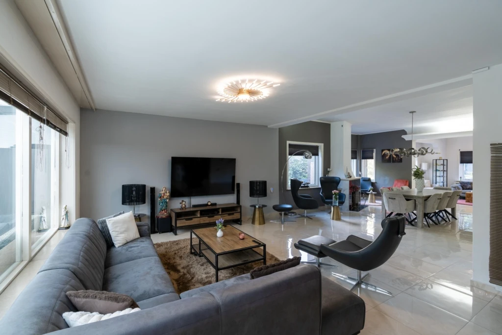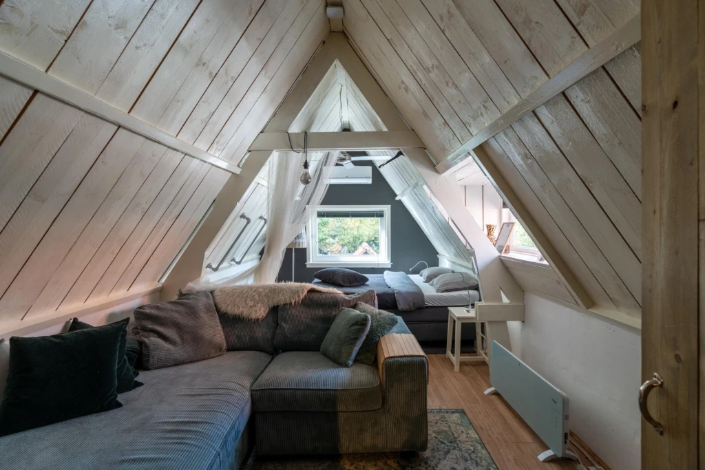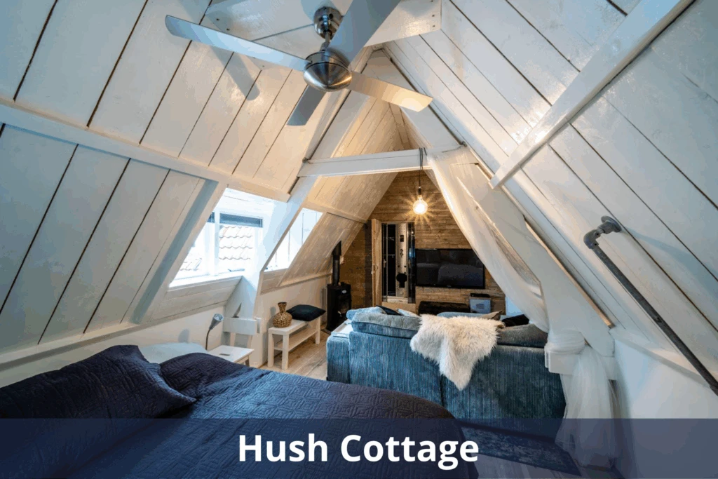 Via de keuken is de bijkeuken bereikbaar, met opbergruimte, aansluitingen voor wasmachine en droger, een stortbak en een trapopgang naar de B&B-kamer ‘De Cottage’. Gasten maken eveneens gebruik van deze toegang. Aan de andere zijde van de villa bevindt zich de royale living met woon- en eetgedeelte. Opvallend zijn de vele raampartijen, die zorgen voor een royale lichtinval en verbinding met de tuin. De ruimte beschikt onder meer over een robuuste schouw met open haard en biedt uitzicht op zowel de voor- als achtertuin. Via een eigen entree aan de tuinzijde is de B&B-kamer ‘The Hush Room’ te bereiken. Deze kamer grenst aan de woonkamer en de centrale hal en heeft een aparte toegang van buitenaf.
