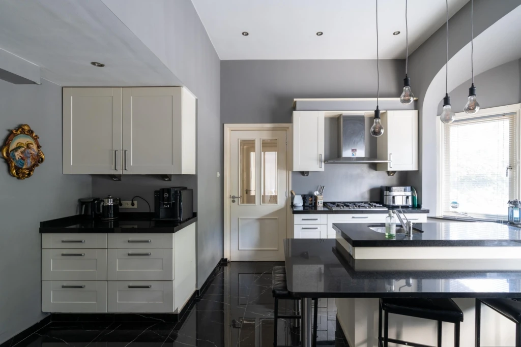 De entree, met de originele voordeur, leidt via een tussenhal naar de centrale hal. Vanuit deze hal zijn de keuken, het gastentoilet, de woonkamer en de trapopgang bereikbaar. De moderne keuken is uitgerust met een kookeiland met zitgelegenheid, een koffiecorner en een kastenwand. Het granieten werkblad maakt deze keuken helemaal af. Aanwezig zijn een ATAG vijfpits gaskookplaat, een Bosch heteluchtoven, een Bosch magnetron, een vaatwasser en een Amerikaanse koel-vriescombinatie. De begane grond is voorzien van vloerverwarming.