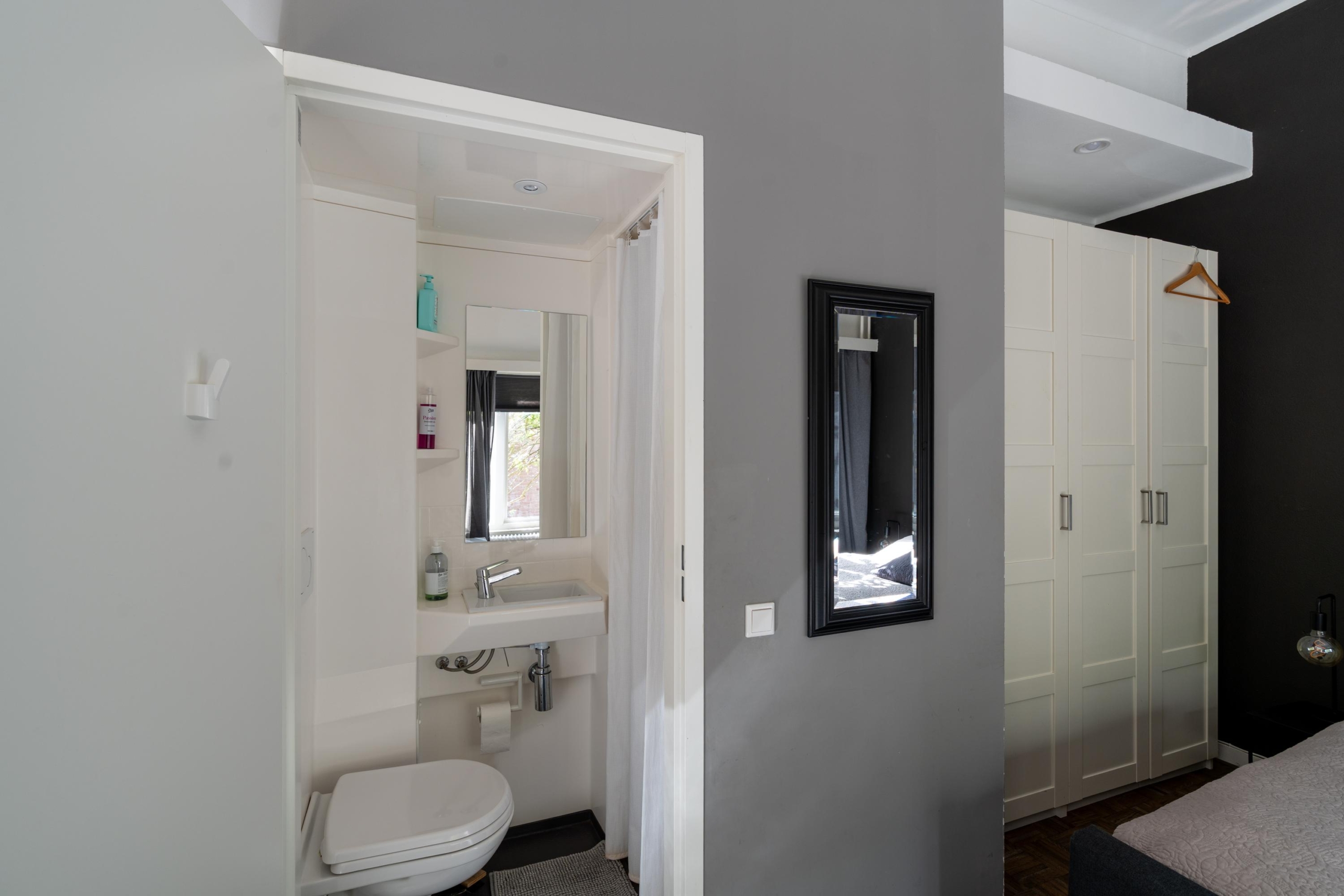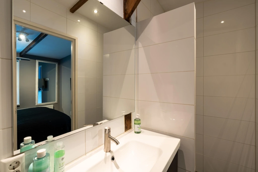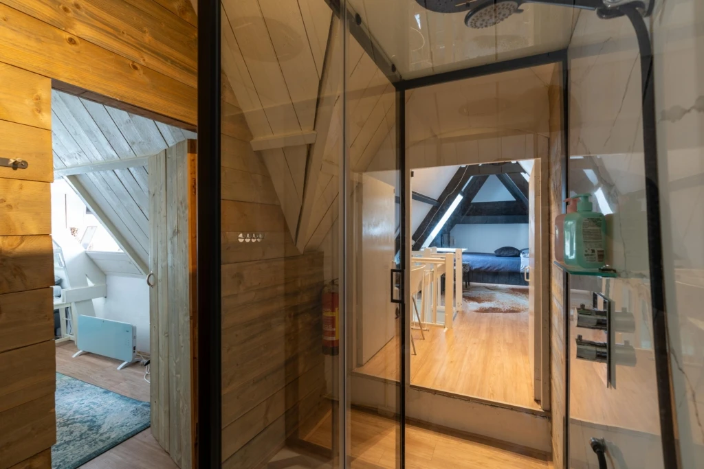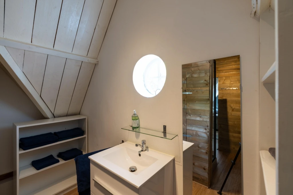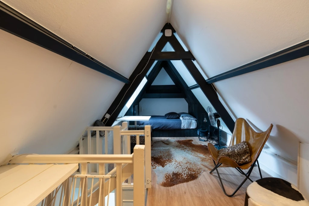 Via het trappenhuis is de tweede verdieping bereikbaar. Deze etage bestaat uit één slaapkamer met badkamer en suite. De ruimte is sfeervol en geniet van veel lichtinval. De badkamer en suite is uitgerust met een toilet, regendouche en een badkamermeubel met waskom.