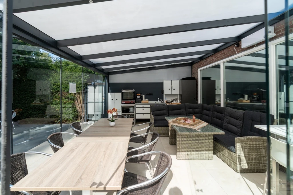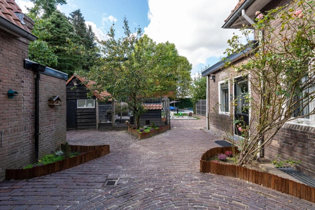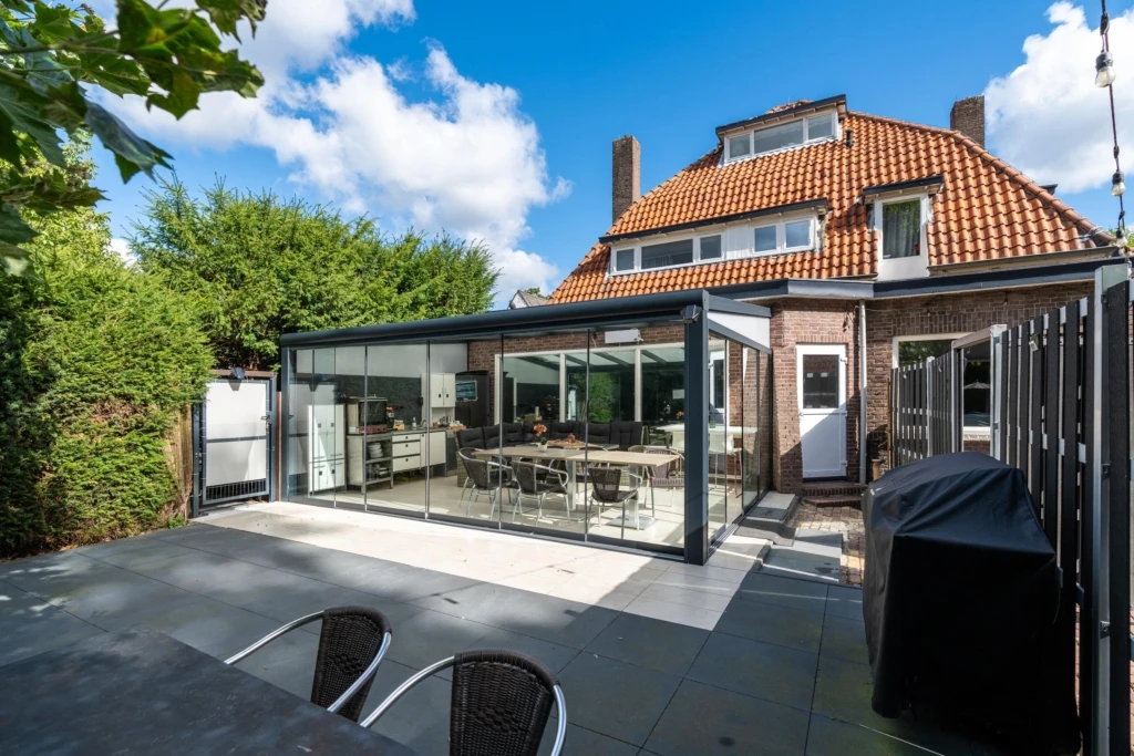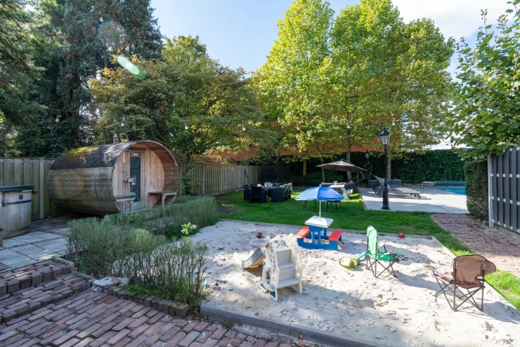 Door de volwassen boompartijen aan de voorzijde, op eigen terrein, ligt de villa beschut en privé. Aan de voorkant bevindt zich een ruime parkeerzone (op eigen terrein) met een vijverpartij. De villa bestaat uit twee woonlagen en een royaal bijgebouw, waarin twee van de vijf B&B-kamers zijn gevestigd. De overige drie kamers bevinden zich in de villa zelf. De groene tuin is ingericht met een zwembad, hottub, sauna en meerdere terrassen. In de afgelopen jaren zijn diverse investeringen gedaan, waaronder 28 zonnepanelen (2021), een nieuwe cv-installatie (2025) en een vernieuwde meterkast. De zonnepanelen leveren circa 5.507 kWh per jaar op.