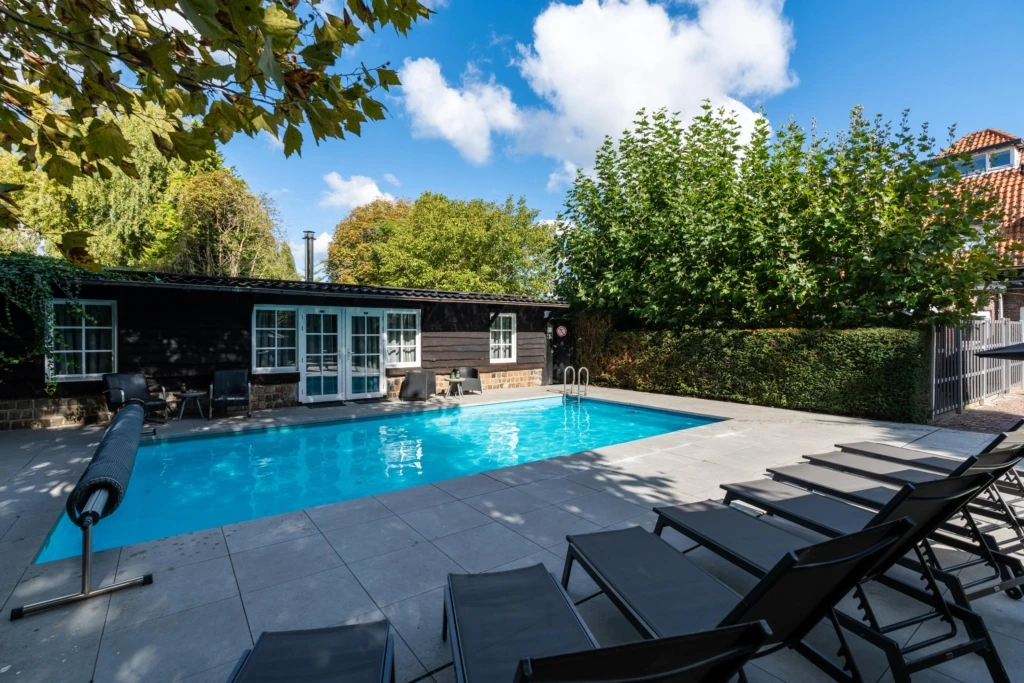 Door de volwassen boompartijen aan de voorzijde, op eigen terrein, ligt de villa beschut en privé. Aan de voorkant bevindt zich een ruime parkeerzone (op eigen terrein) met een vijverpartij. De villa bestaat uit twee woonlagen en een royaal bijgebouw, waa...