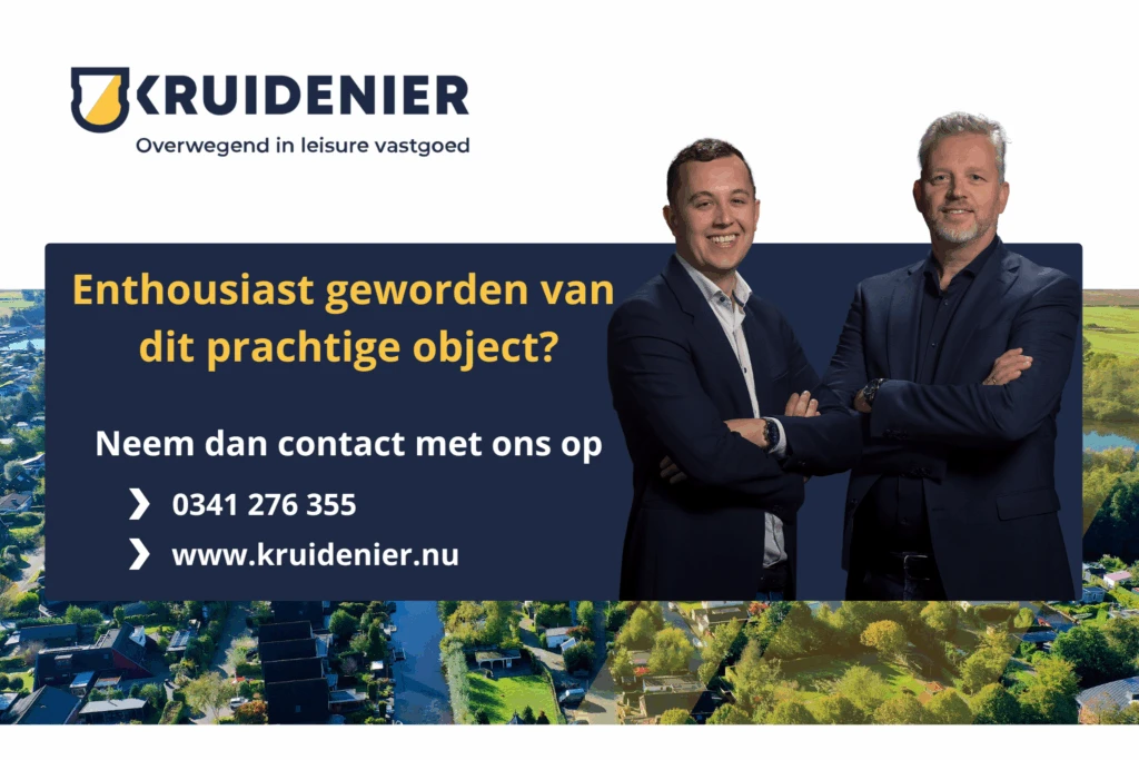 Deze informatie is geheel vrijblijvend, uitsluitend bestemd voor geadresseerde en niet bedoeld als een aanbod. Ten aanzien van de juistheid kan door Kruidenier Recreatie Bedrijfsmakelaardij B.V. geen aansprakelijkheid worden aanvaard, noch kan aan de vermelde informatie enig recht worden ontleend. Alle opgegeven aantallen, maten en oppervlakten zijn indicatief.